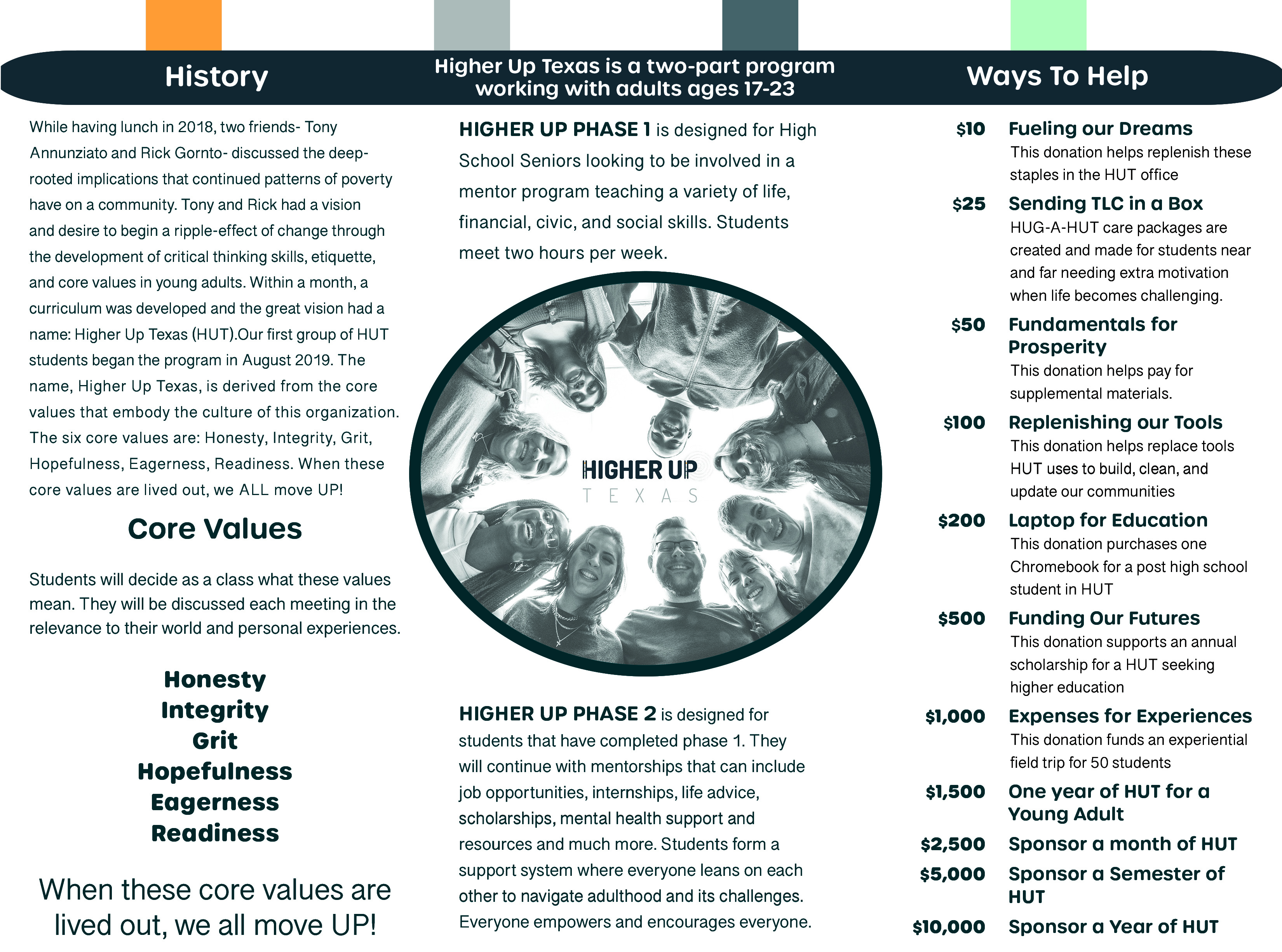 Higher Up Texas wanted a tri-fold brochure that gave information but also showcased their students who benefit from this non-profit. I wanted to incorperate their soft colors and impactful words so the piece spoke for itself.